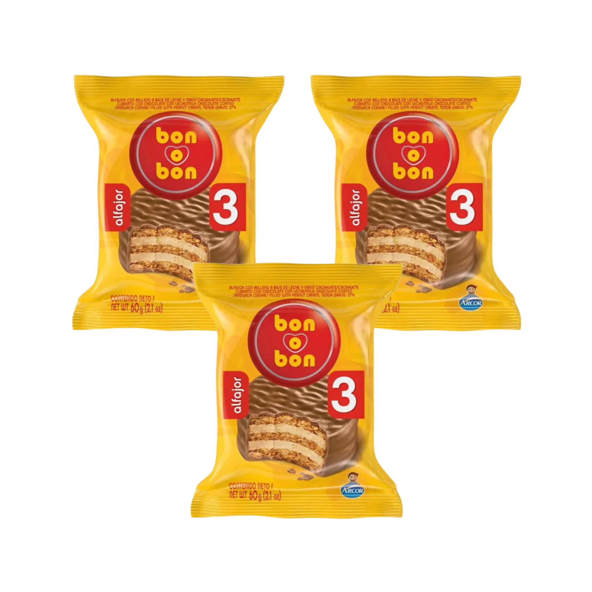 Alfajor Bon o Bon TRIPLE, relleno a base de Leche y Maní (60gr) (Pack de 3u) (180gr)